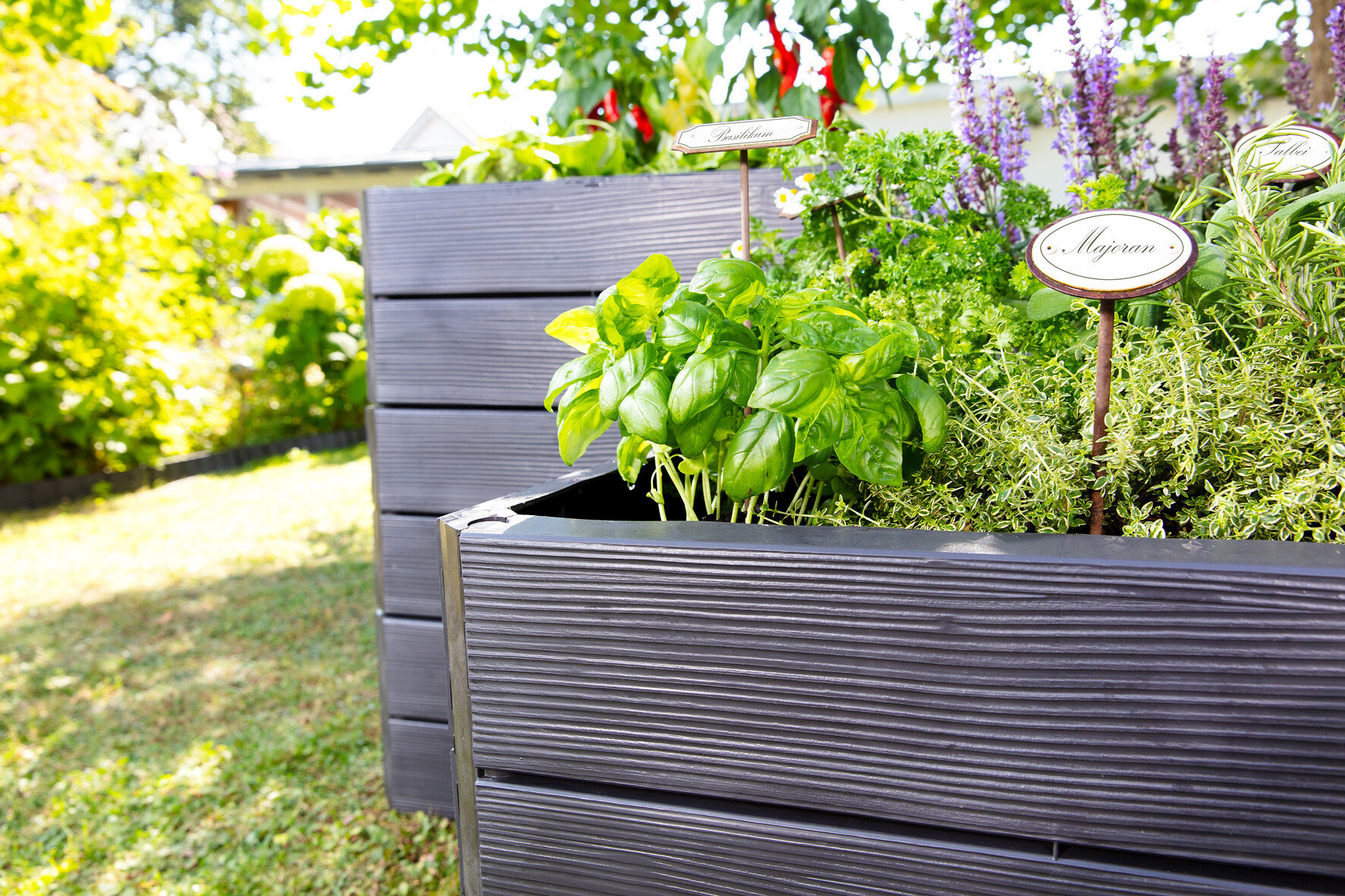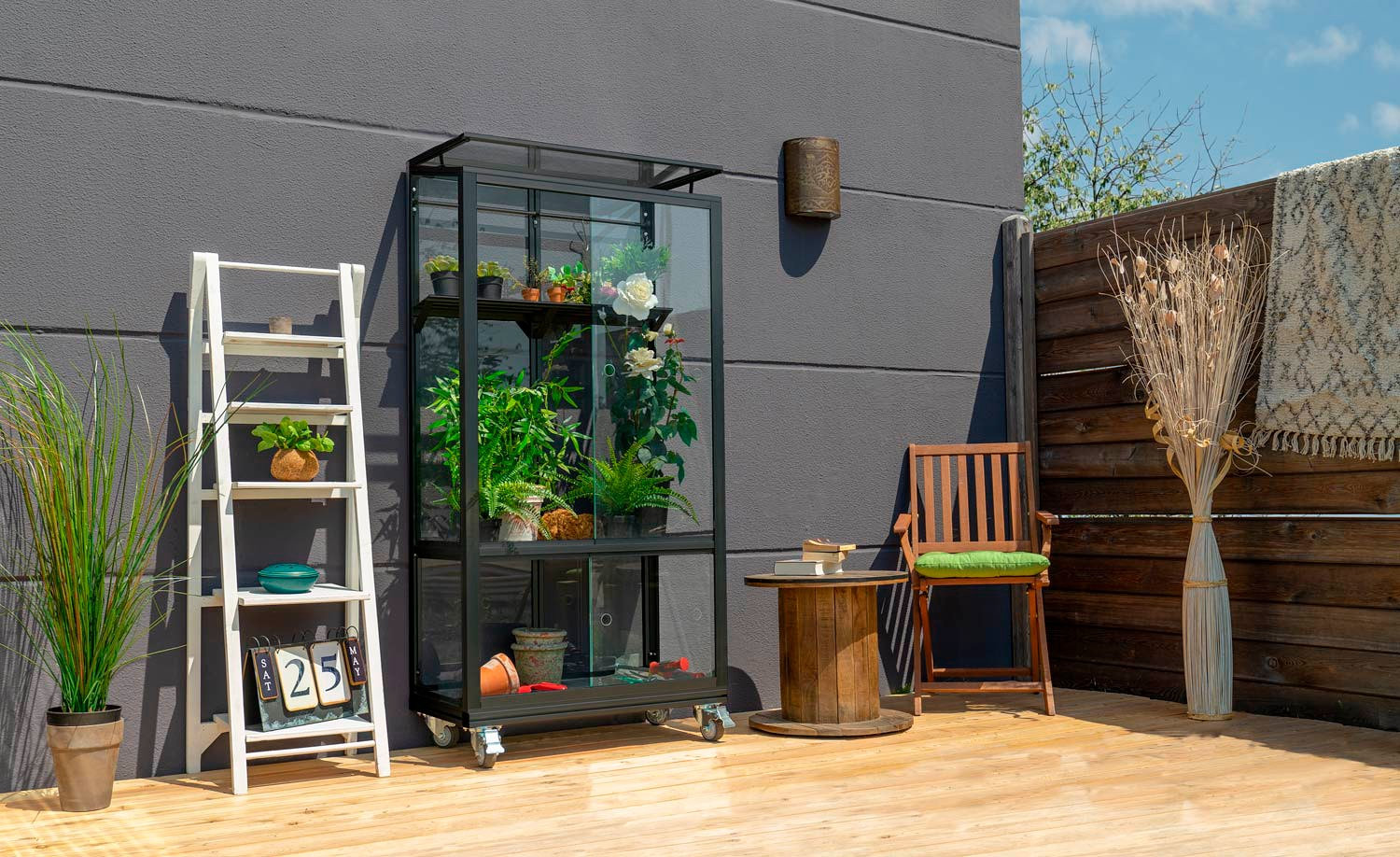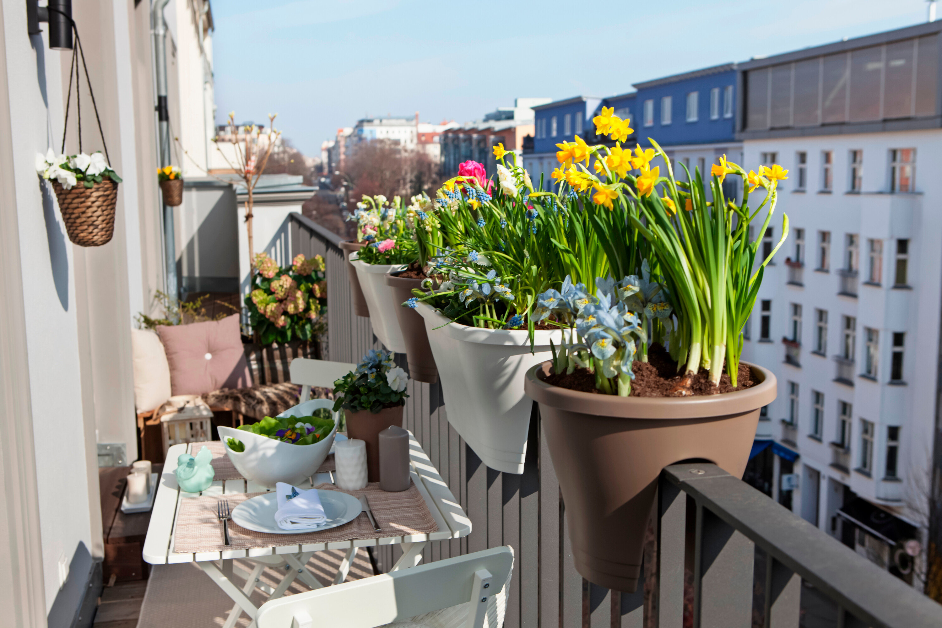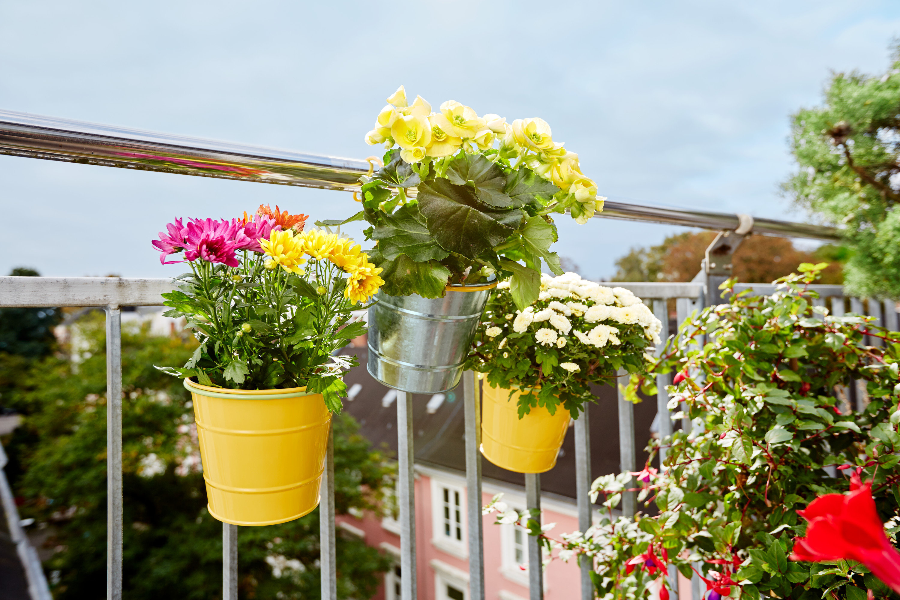 Kombinieren Sie zum Beispiel dicht wachsende Rankpflanzen in grossen Bodenkübeln mit einer Vielfalt an bunten Blumen in Balkonhängetöpfen oder trendigen Pflanztaschen. Oder nutzen Sie eine Blumentreppe, auf der Sie unterschiedliche Pflänzchen arrangieren. So entsteht ein besonders üppiger, lebhafter Minigarten. Mithilfe praktischer Hochbeete und kleiner Gewächshäuser können Sie ausserdem aromatische Kräuter und Beeren aus eigenem Anbau geniessen.