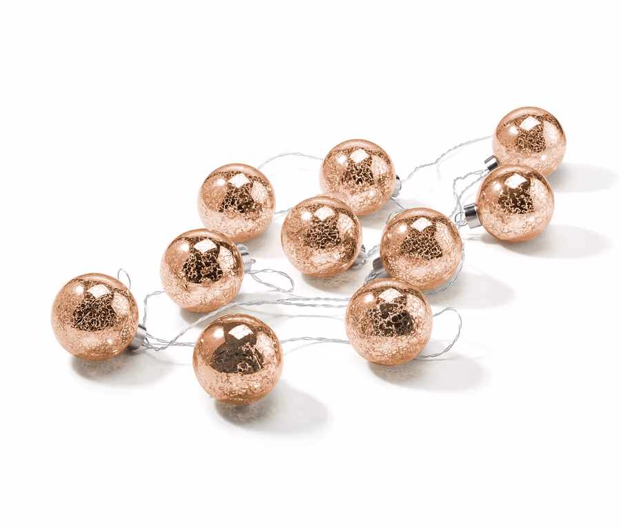 Mit dieser LED-Kugel-Lichterkette bekommt der Weihnachtsschmuck festlichen Glanz: Ihre 10 Glaskugeln sind in dekorativer Bauerngoldoptik gestaltet und werden durch fest integrierte LEDs von innen mit warmweissem Licht zum Strahlen gebracht – das macht sie zur Krönung einer jeden Festtagsdeko!