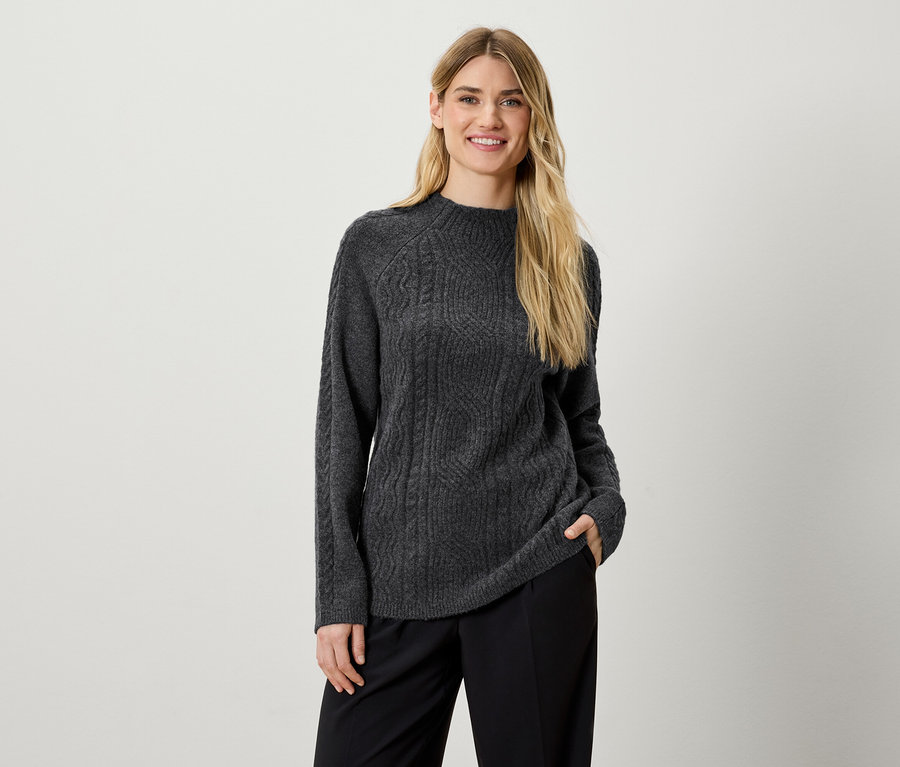 - Zopfstrickmuster auf Vorderseite und Ärmeln