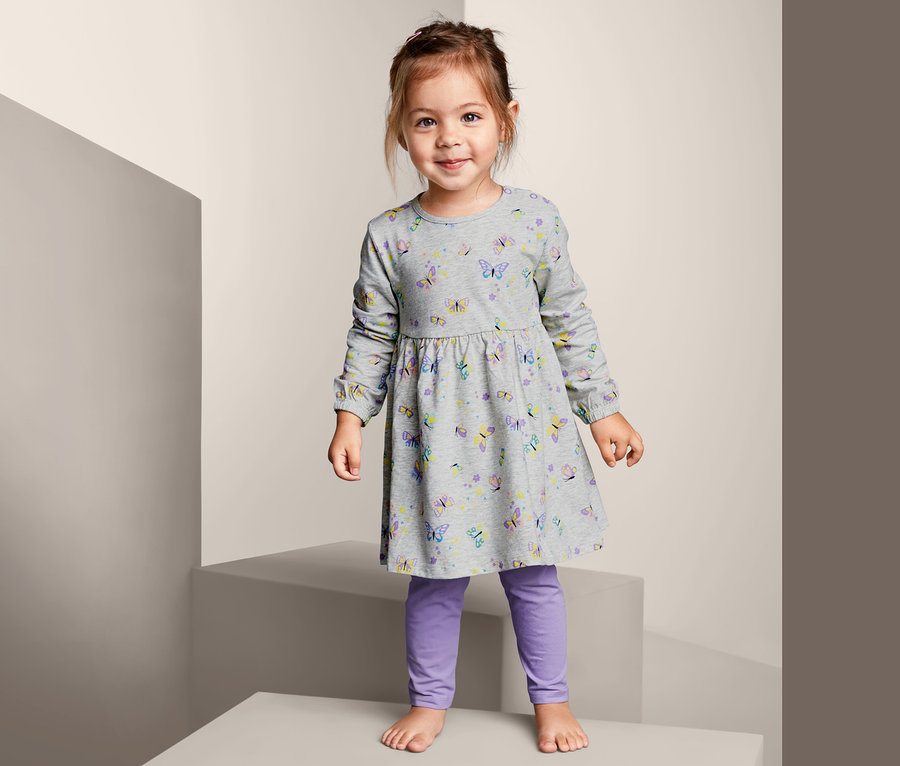 Das Kleid ist in den Grössen von 62/68 bis 86/92 zum einfachen An- und Ausziehen mit Druckknöpfen auf der Schulter gefertigt und es hat eine Teilungsnaht mit dekorativer Raffung auf Hüfthöhe. Optisch kann es bei den Kleinen mit seinem Schmetterling-Alloverprint punkten, dessen violette Elemente von den bequemen Leggings wieder aufgenommen werden. Das perfekte Outfit zum Schick-Aussehen – und zum Rumtoben.