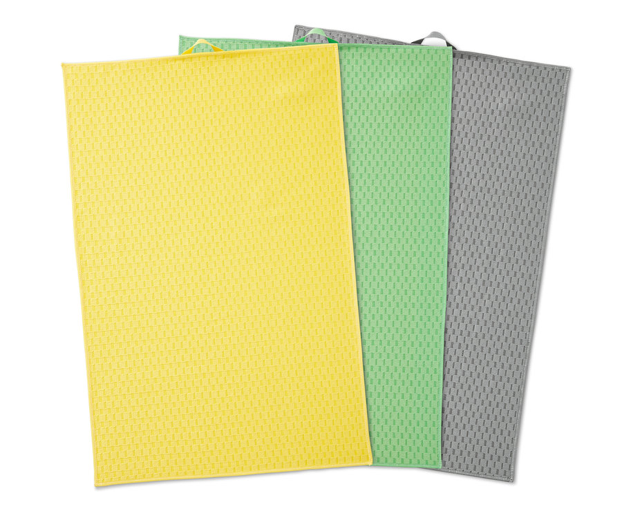 Alle drei Tücher haben eine hochflorige Seite für unebene Flächen und eine fein strukturierte für glatte Flächen. Sie leisten auch auf Spiegeln, Fliesen und Fenstern ganze Arbeit und trocknen dank Microfaser-Anteil fusselfrei. Ausserdem macht die Faser die Handtücher langlebig, saugstark und schnelltrocknend.