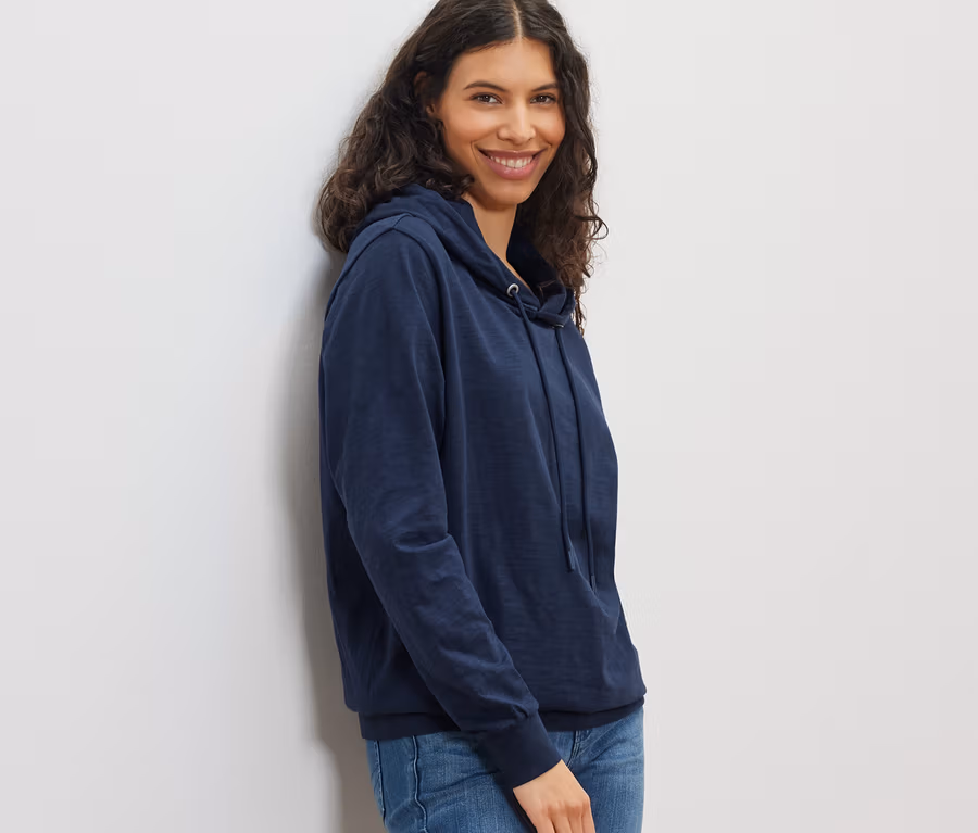 - Elastische Rippbündchen an Ärmelabschluss und Saum
