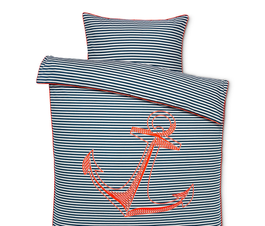 Für den gesunden Schlaf ist diese schöne maritime Bettwäsche designt worden. Sie lässt sich wenden, auf einer der beiden Seiten gesellt sich zu den klassischen blauen Matrosenstreifen noch ein grosses Ankermotiv dazu. Decke und Kissen sind ausserdem mit einem dekorativen Keder versehen. Die feine, dicht gewebte Qualität aus reiner Baumwolle fühlt sich besonders weich, leicht und glatt an, ausserdem ist der Stoff aus Bio-Baumwolle angenehm temperaturausgleichend und saugfähig. Durch einen Reissverschluss lässt sich die Bettwäsche einfach und schnell beziehen.