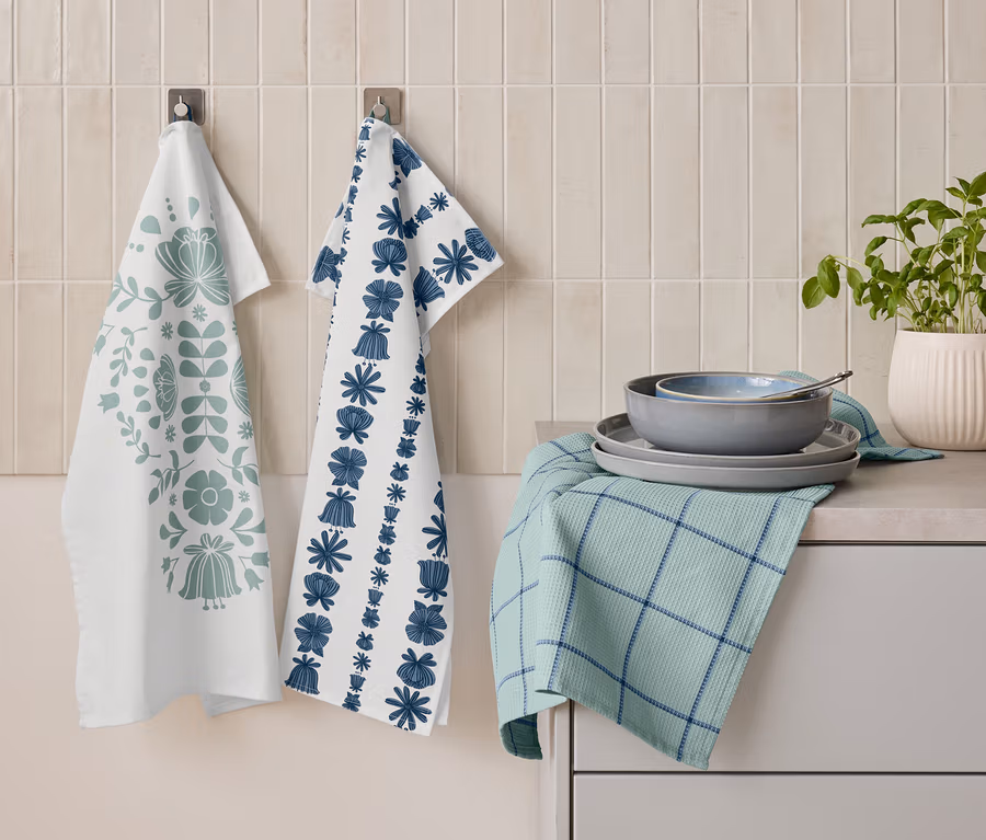 - 1x salbeigrün mit Waffelstruktur, 1x weiss mit dunkelblauem Skandi-Muster, 1x weiss mit salbeigrünem Skandi-Muster