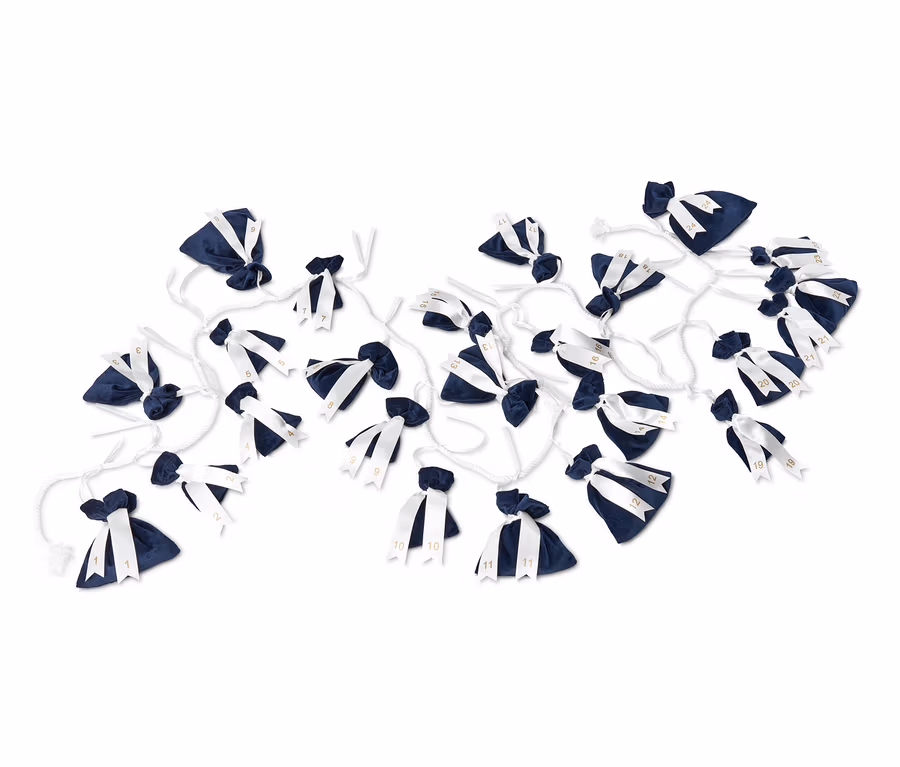- Beutel königsblau. Satinbänder cremeweiss mit goldfarbener Nummerierung