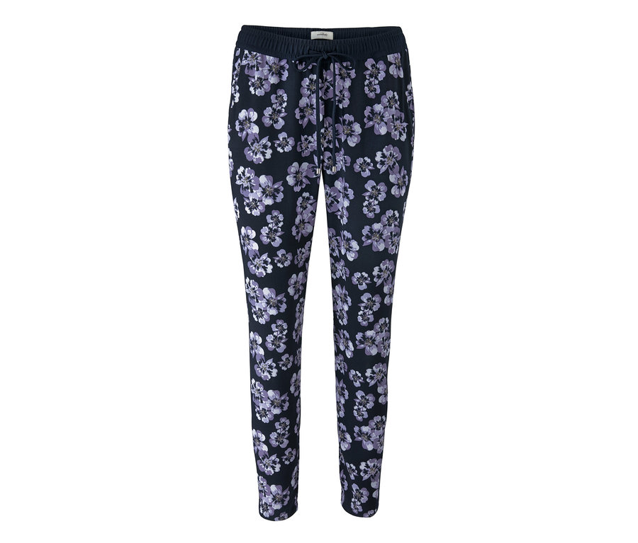 Lässig fallende Webhosen mit floralem Alloverprint sind nicht nur schwer im Trend – sie sind vor allem unwahrscheinlich bequem. Diese hier ist knöchellang, besteht aus weich fliessender, leicht gekreppter Webware und hat einen breiten, elastischen Komfortbund mit Tunnelzug. Der Bund lässt sich mit einem Bindeband in seiner Weite anpassen. Für den besonders durchgestylten Auftritt kommt diese Hose mit Galonstreifen an der Seitennaht und zwei Zier-Gesässtaschen daher. Vorne hat die Webhose zwei Eingrifftaschen.