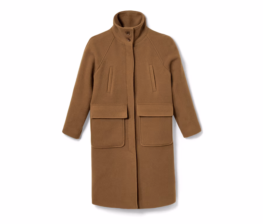 • Ein Teil, das niemals aus der Mode kommt: Aus recycelter Wolle besonders dicht und formstabil gewebt, hält unser Mantel auch während der kalten Tage, was er verspricht. Die leicht überschnittenen Schultern und der hohe Stehkragen machen zusammen mit einem Schal den „Golden September“-Look perfekt.