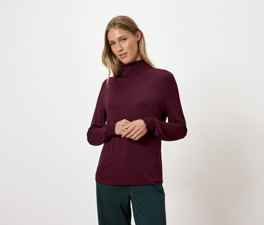- Elastischer, gesmokter Ärmelabschluss und Stehkragen