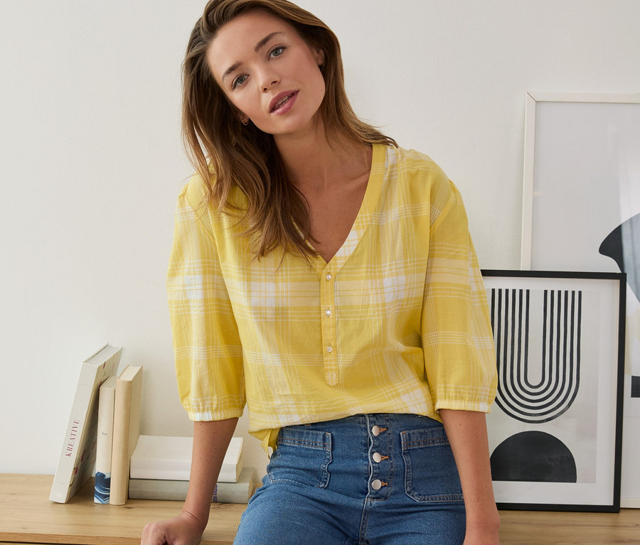 - V-Ausschnitt mit Knopfleiste im Brustbereich