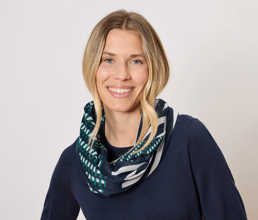- Grafischer Alloverprint und dunkelblau-grün-weisse Streifen