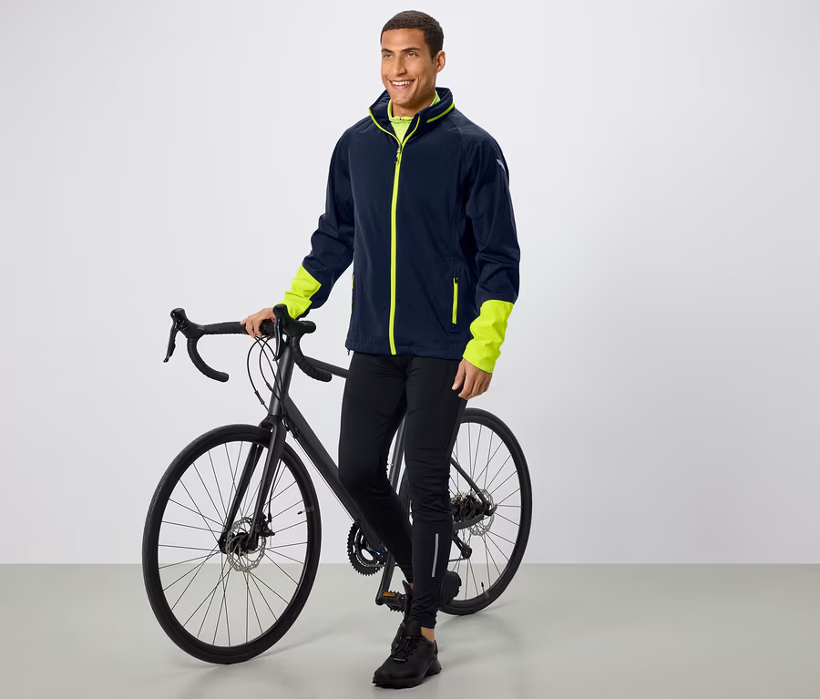 - Dunkelblau mit neongelben Einsätzen an den Armen und in der Kapuze