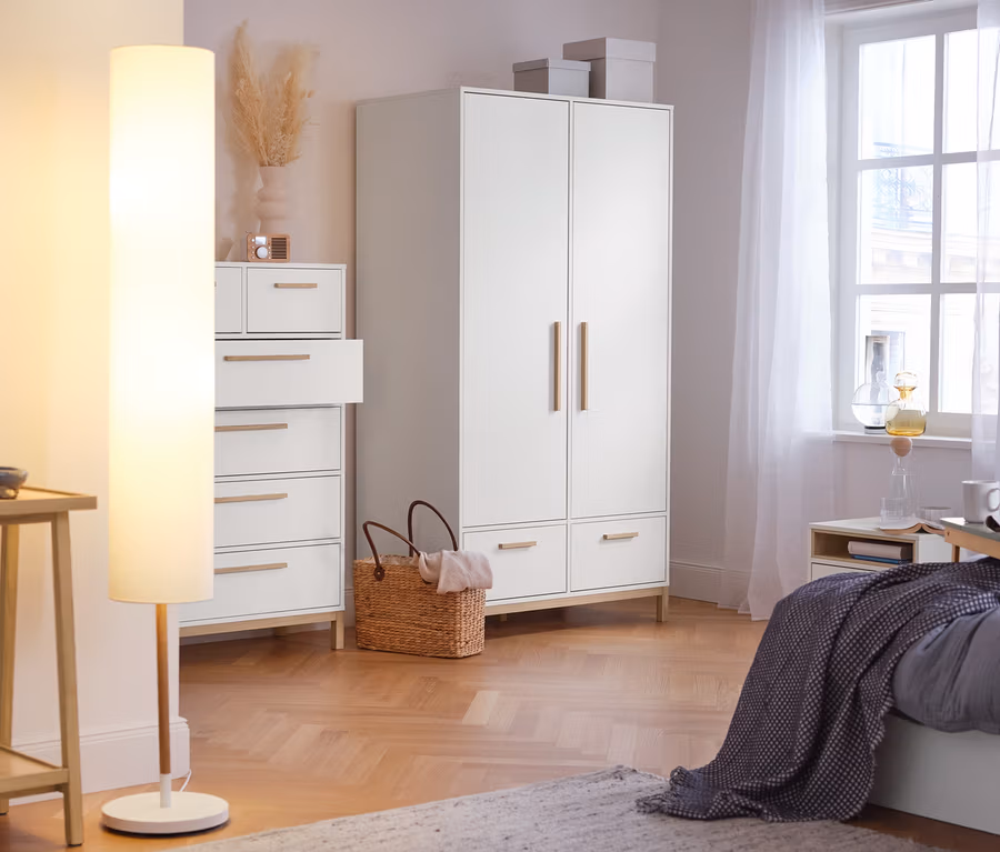 - 2 Kleiderstangen, ein fester Boden hinter jeder Tür sowie 6 höhenverstellbare Einlegeböden für eine individuelle Aufteilung