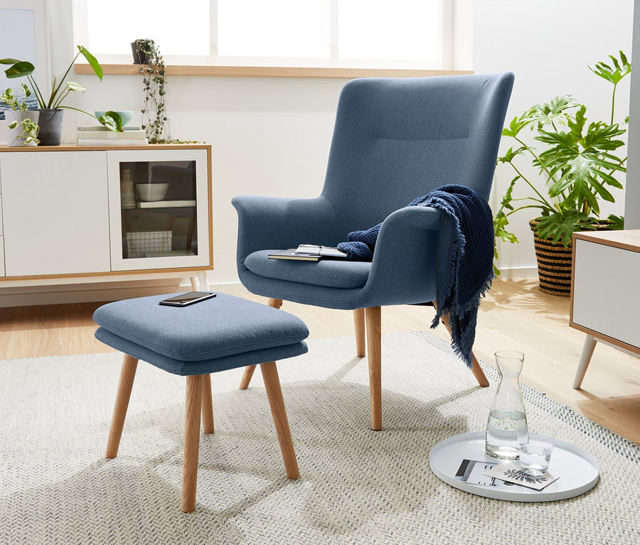 Sitzschale und Rückenlehne sind fest gepolstert und bieten einen besonders hohen Sitzkomfort, der durch das zusätzliche, befestigte Sitzkissen noch erhöht wird. Das Untergestell ist wie die Füsse aus naturfarbenem Eichen-Massivholz – und der passende Fusshocker ist auch gleich mit dabei. Die hochwertigen Bezüge sind besonders strapazierfähig und halten mindestens 20.000 Scheuertouren stand. Schliesslich will man von Lieblingsmöbeln ein bisschen länger etwas haben.