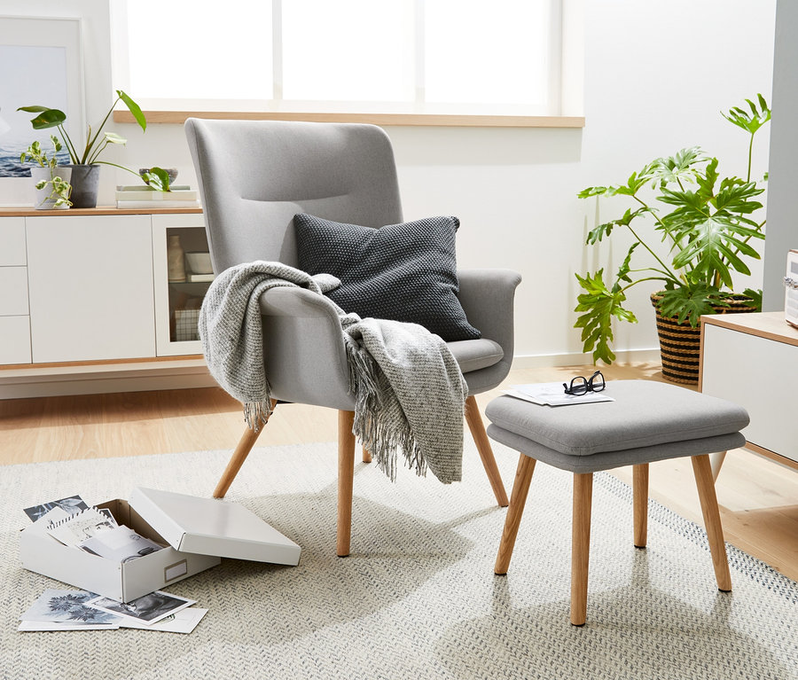 Sitzschale und Rückenlehne sind fest gepolstert und bieten einen besonders hohen Sitzkomfort, der durch das zusätzliche, befestigte Sitzkissen noch erhöht wird. Das Untergestell ist wie die Füsse aus naturfarbenem Eichen-Massivholz – und der passende Fusshocker ist auch gleich mit dabei. Die hochwertigen Bezüge sind besonders strapazierfähig und halten mindestens 20.000 Scheuertouren stand. Schliesslich will man von Lieblingsmöbeln ein bisschen länger etwas haben.