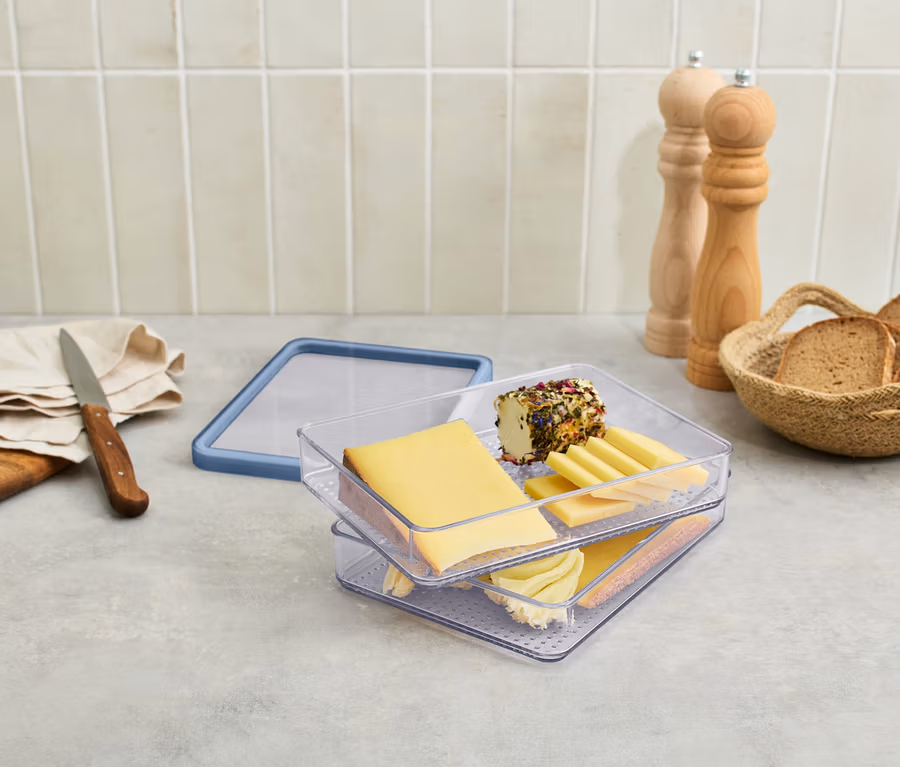- 2 Fächer zum platzsparenden Aufbewahren von Aufschnitt im Kühlschrank