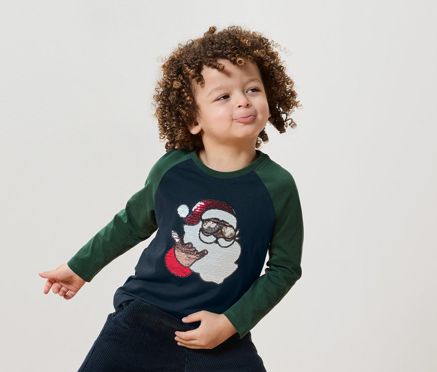 - Dunkelblau mit tannengrünen Raglan-Ärmeln und rot-weissem Weihnachtsmann-Motiv
