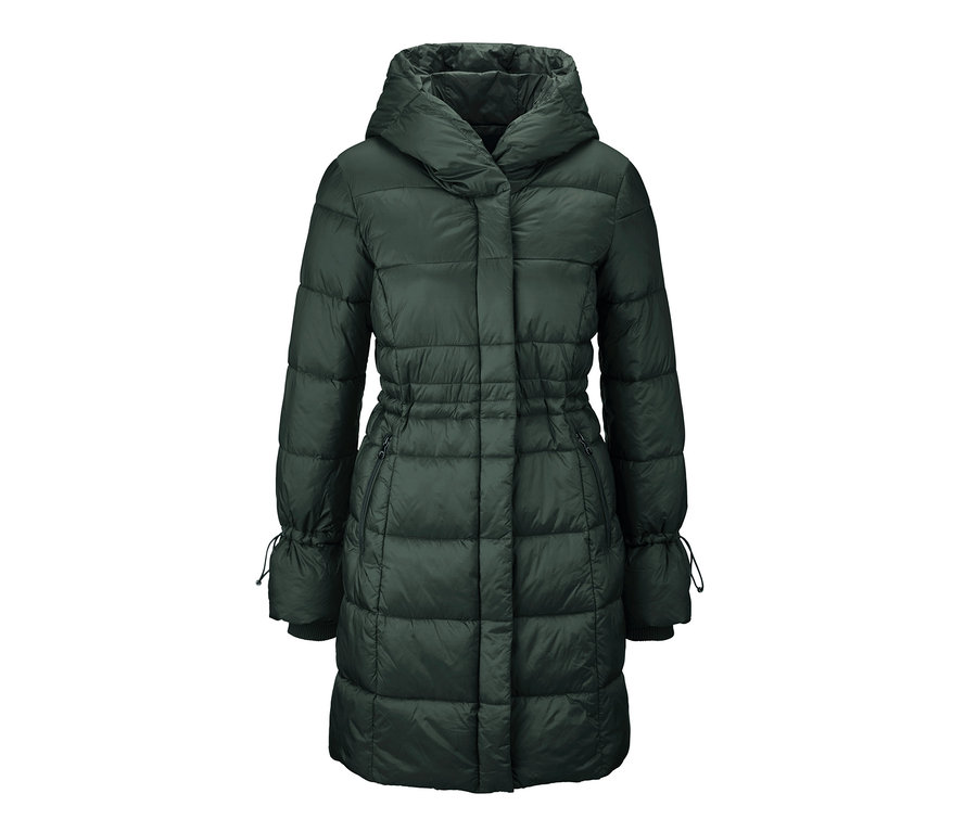 Der Mantel kann mit einem 2-Wege-Reissverschluss sowie Druckknöpfen verschlossen werden und ist mit Wiener Nähten gearbeitet, die eine feminine Silhouette unterstreichen. Auf der Vorderseite des Mantels sitzen zwei Eingrifftaschen und sowohl im elastischen Tailleneinsatz sowie am Ärmel ist jeweils ein Tunnelzug mit Stoppern eingefasst.