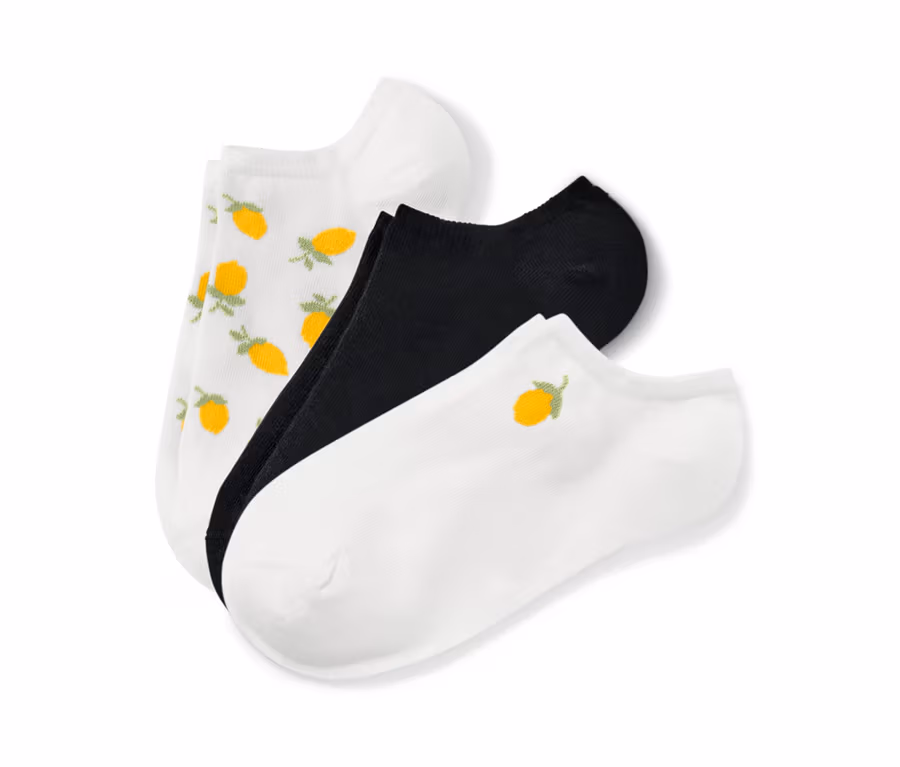 1x weiss mit platzierter Zitronen-Stickerei, 1x weiss mit ganzflächigem Zitronen-Einstrick, 1x schwarz
