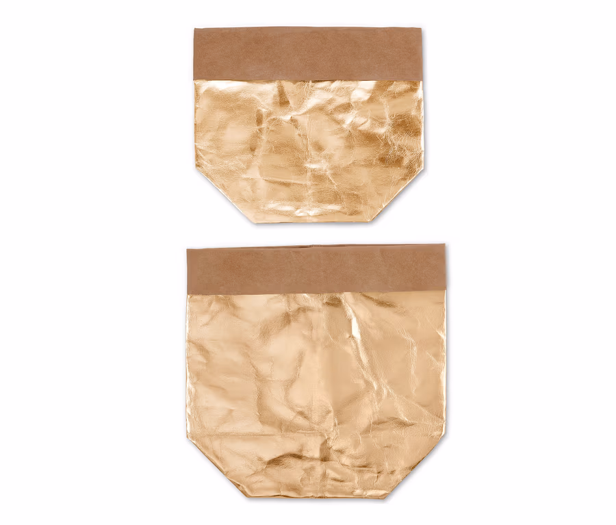 Diese zwei runden Körbe sind in ihrem glänzenden Gold nicht nur dekorativ, sondern auch besonders stabil. Mit dem abwischbaren Kraftpapier lassen die Körbchen sich vielseitig einsetzen und sogar zusammenfalten. So schön können Platzsparer sein!