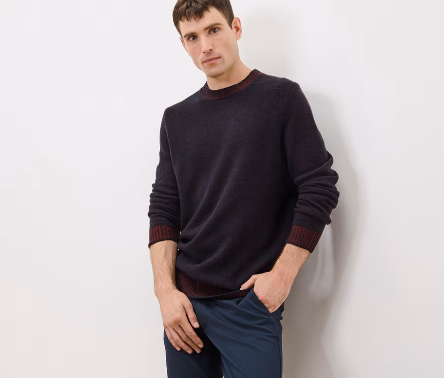 - Rippstrickbündchen an Ausschnitt, Ärmeln und Saum