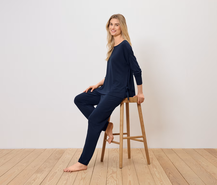 - Dieser Pyjama beinhaltet Fasern aus nachhaltigem Holz.
