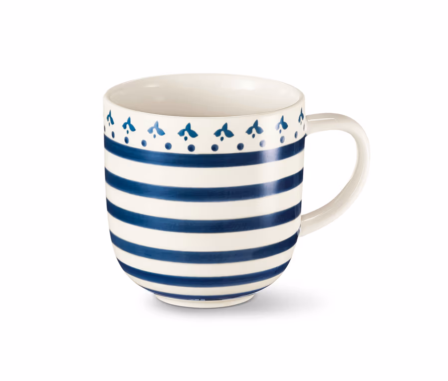 Wenn der Tag mit mediterraner Leichtigkeit starten kann, geht er doch gleich viel besser los. Dieser Becher aus hochwertiger Keramik verbreitet auf dem Frühstückstisch, auf der Kaffeetafel oder einfach zwischendurch ein sommerlich leichtes Flair – was natürlich an seinem aufwändigen, handgemalten Dekor liegt. Der Becher fasst etwa 450 Milliliter Kaffee, Kakao oder Lieblingstee – für lange Momente des Innehaltens und Geniessens.