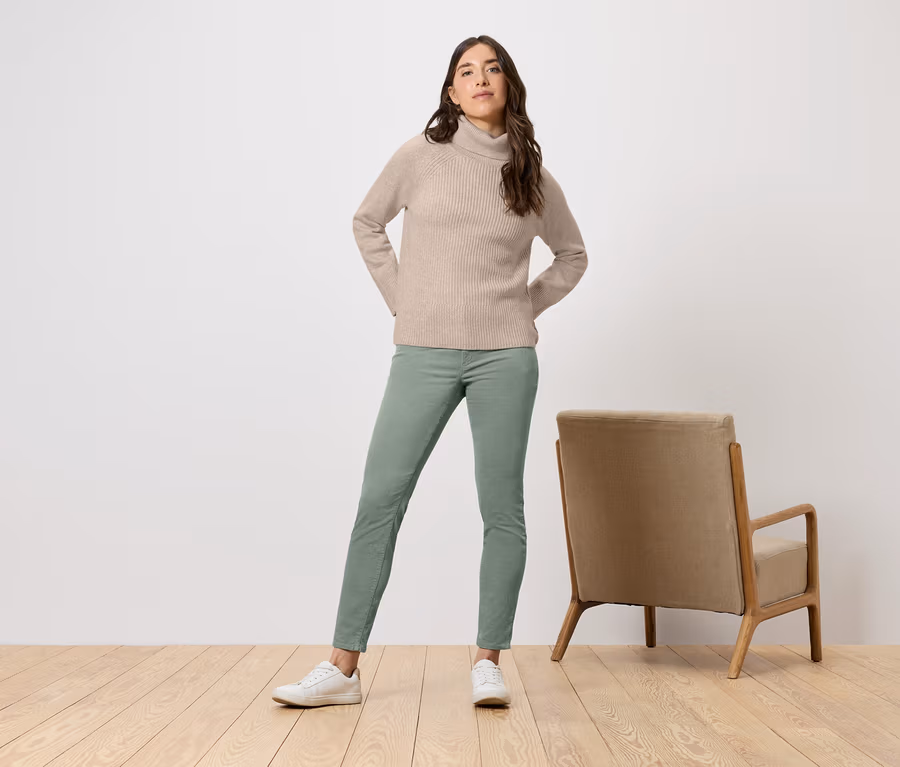 - Elastische Rippbündchen an Rollkragen, Ärmelabschluss und Saum