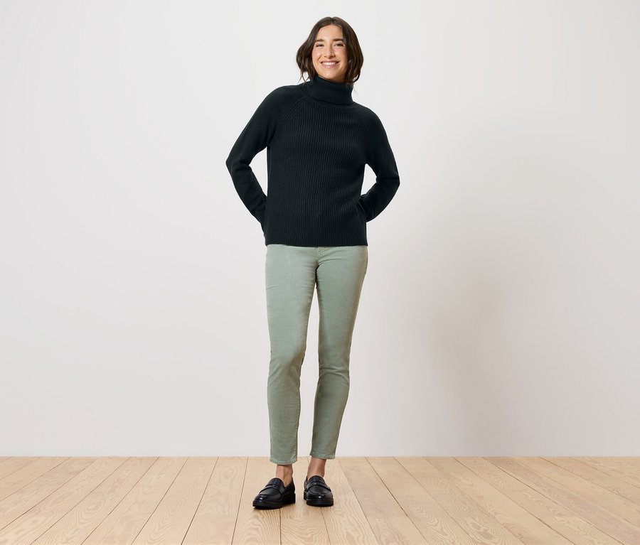 - Elastische Rippbündchen an Rollkragen, Ärmelabschluss und Saum