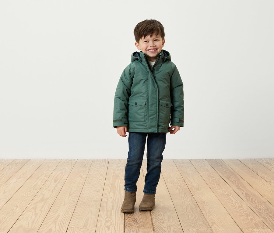 - Aussenjacke: Frontreissverschluss mit Windschutzleiste, grossem Zipperanhänger und Kinnschutz