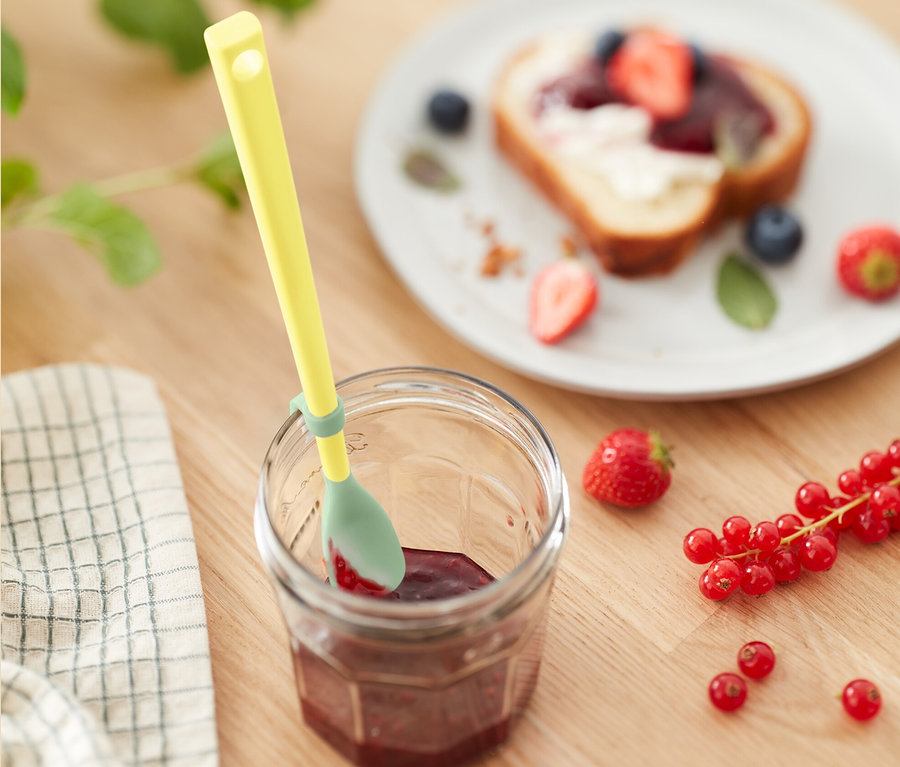 • Mit speziell geformter Laffe aus elastischem Silikon zum restlosen Leeren von z.B. Marmeladengläsern