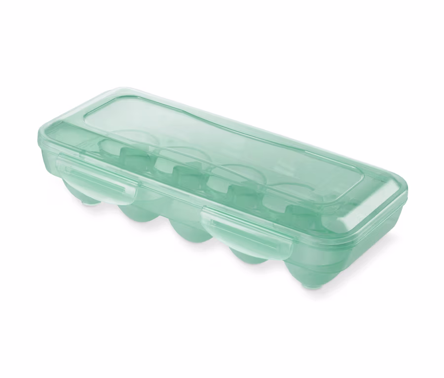 Wer beim Kauf von Eiern auf den Eierkarton verzichten möchte, kann auf diese praktische Eier-Aufbewahrungsdose zurückgreifen. Die Dose wurde extra so designt, dass darin ganze zehn Eier der Grösse M oder L sicher transportiert werden können.