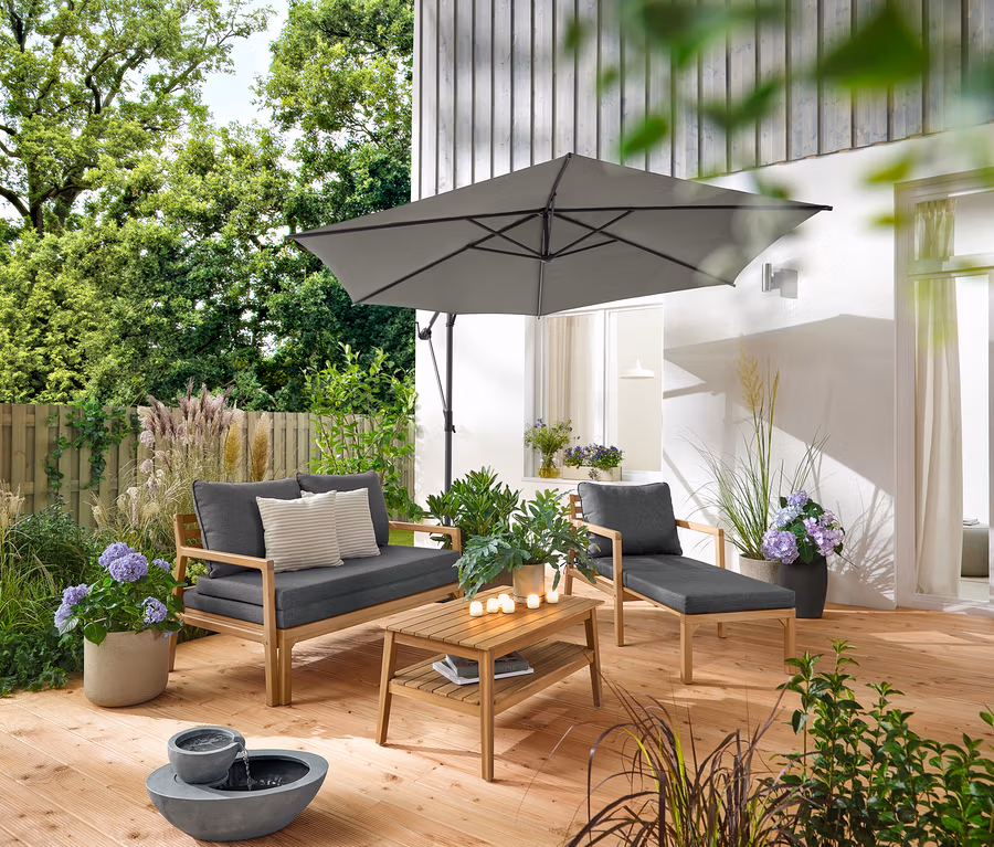 • Polsterbezüge aus hochwertigem Polyester, Haptik und Optik erinnern an einen Indoor-Stoff