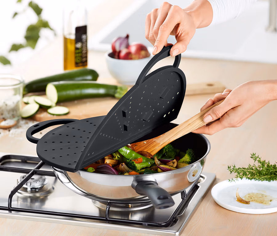 Als Spritzschutz passt er für Pfannen und Töpfe mit 20, 24 oder 28 cm Durchmesser und gewährt durch seinen Klappmechanismus freien Blick auf das Bratgut. Dafür, dass dieses auch schön knusprig bleibt, sorgen die vielen kleinen Löcher, durch die Dampf entweichen kann. Ausserdem ist der Küchenhelfer angenehm unkompliziert: Er hat zwei praktische Handgriffe und macht sich zusammengeklappt schön schlank im Schrank.
