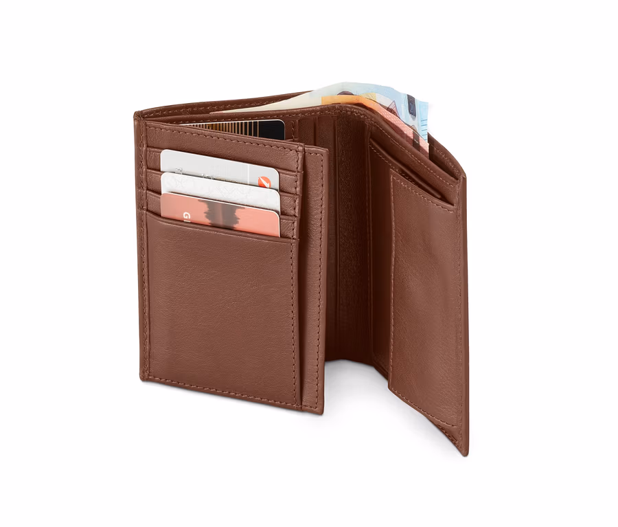- Portemonnaie mit 8 Kartensteckfächern, 2 Scheinfächern, 1 Münzfach, 1 Mesh-Fach und 4 breiten Steckfächern
