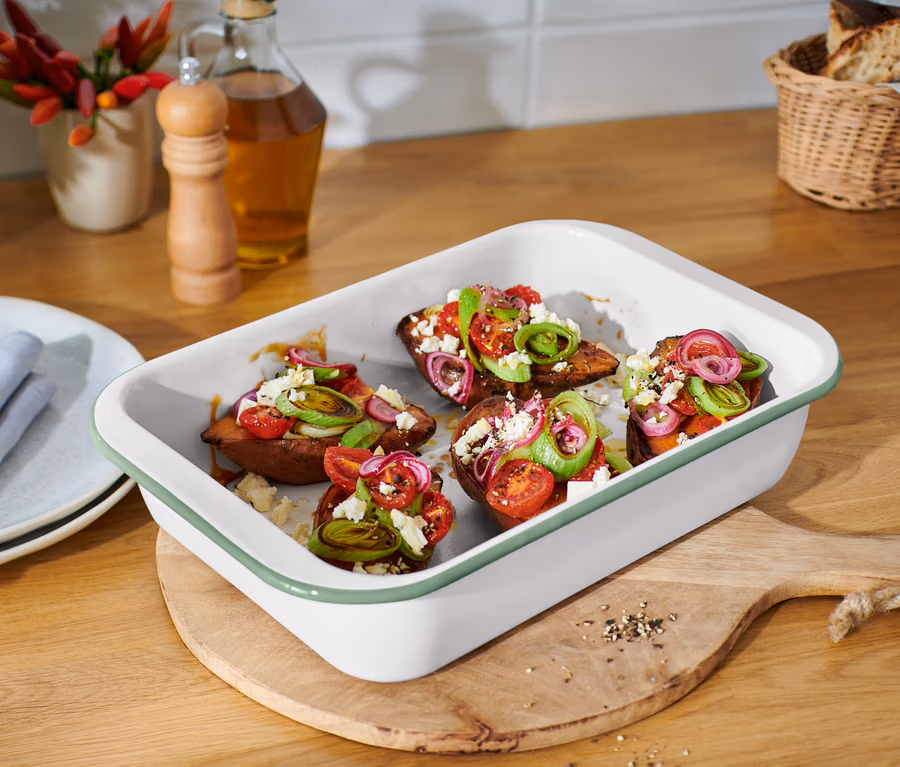 - Aus ofenfestem 3-fach emailliertem Metall – besonders korrosionsbeständig