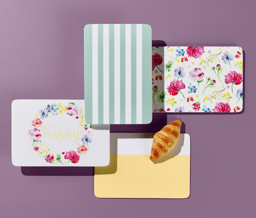 Diese vier Schneidebretter können einiges ab – sollten sie auch, denn mit ihren verschiedenen frühlingshaften Looks kommen sie mit Sicherheit recht oft auf den Tisch oder die Arbeitsplatte. Die Brettchen sind aus formstabilem Melamin gefertigt, sie sind leicht zu reinigen und dadurch besonders hygienisch. Sie lassen sich als Frühstücksbrettchen ebenso nutzen wie beim Kochen zum Schneiden von Zutaten.