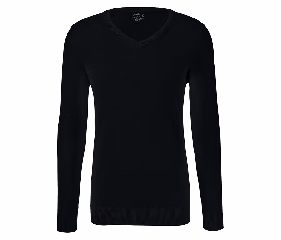 • Elastische Rippstrickbündchen an V-Ausschnitt, Ärmelabschluss und Saum