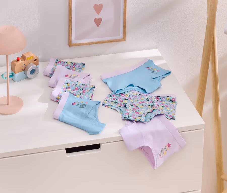 - 2x flieder mit kleinem Blumen-Print, 3x BlĂĽmchen-Alloverprint, 2x himmelblau mit kleinem Blumen-Print