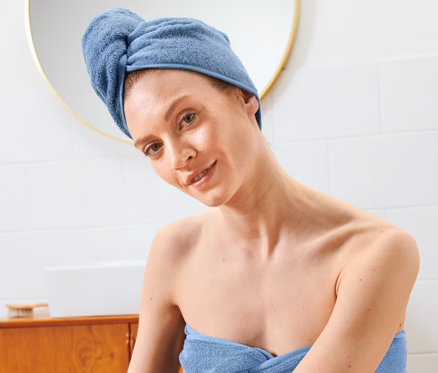 - Dieses Turban-Handtuch schützt Wasserressourcen.