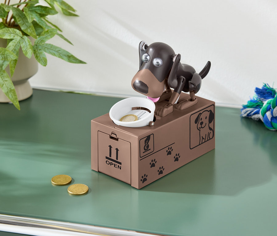 • Hund bewegt sich beim Einlegen der Münze in den Napf und nimmt sie auf
