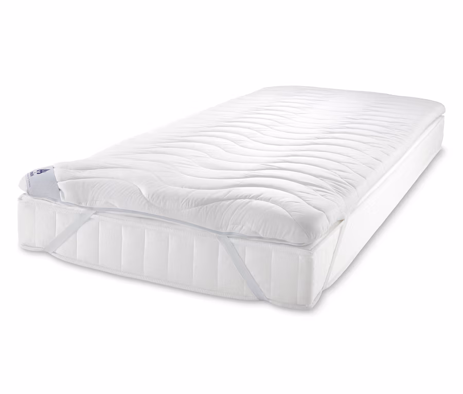 Die Matratzenauflage hat einen weich wattierten, abnehmbaren Bezug mit Wellensteppung und vier Gummizüge, dank derer sie im Handumdrehen rutschfest sitzt. Sie hat eine Höhe von etwa 5 Zentimetern und ist exklusiv bei Tchibo erhältlich.