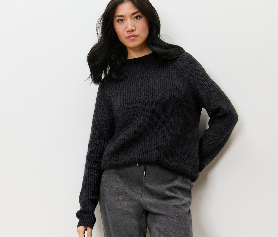 - Elastische Rippbündchen an Stehkragen, Ärmelabschluss und Saum