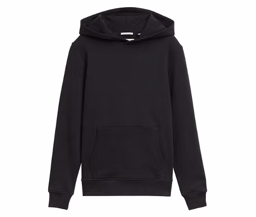 • Kängerutasche auf der Vorderseite und Rippbündchen am Ärmel