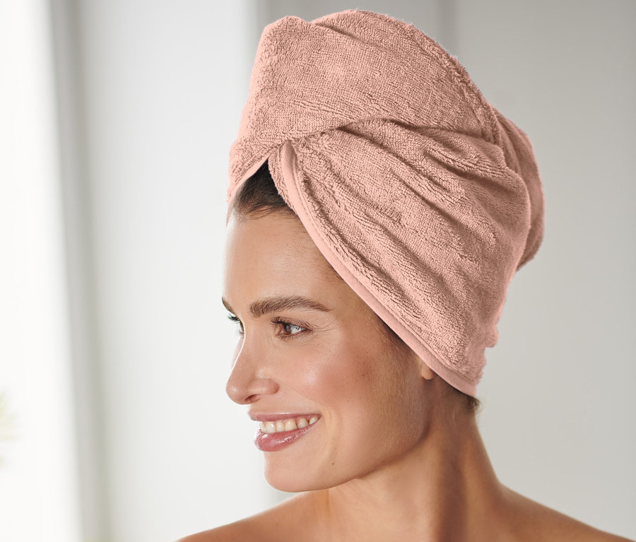 - Dieses Turban-Handtuch schützt Wasserressourcen.