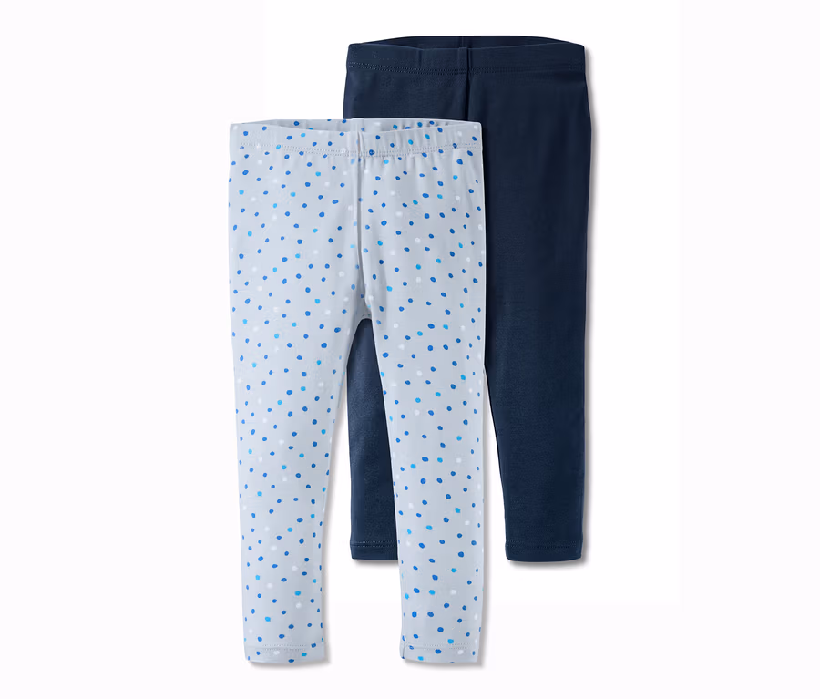 Beim Toben, Spielen oder bei den ersten Schritten brauchen die Kleinsten natürlich auch eine Hose, die das alles mitmacht. Und mit diesen Leggings gibt es die gleich im Doppelpack. Die Kinderhosen liegen mit ihrer Baumwoll-Stretch-Qualität besonders weich und angenehm auf der Haut – und machen dabei jede Bewegung mit. Ihr bequemer, elastischer Bund hält sie zuverlässig auf der Hüfte, Elasthan sorgt für Formbeständigkeit, einen perfekten Sitz und hohen Tragekomfort.
