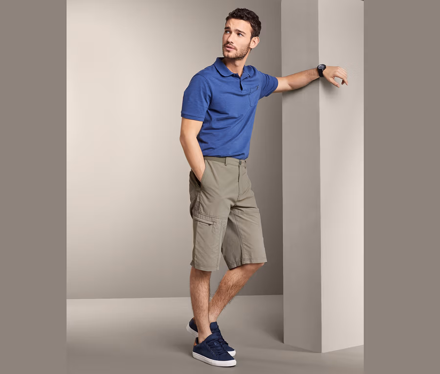 Bei sommerlichen Temperaturen sind Bermudas die perfekte Wahl zu jedem Freizeit-Outfit. Diese kurze Hose ist klassisch gerade geschnitten und ihr elastischer Bund sorgt für einen perfekten Sitz sowie hohen Tragekomfort. Mit ihrer pflegeleichten Baumwoll-Mischqualität liegt sie auch an heissen Tagen angenehm auf der Haut. Die Herrenhose hat zwei seitliche Eingrifftaschen, zwei Gesässtaschen – und ähnlich einer Cargohose gibt es auf halber Beinhöhe zwei zusätzliche Taschen mit Reissverschluss.