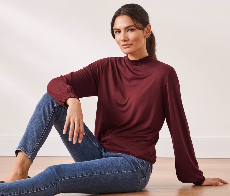 • Elastischer, gesmokter Ärmelabschluss und Stehkragen