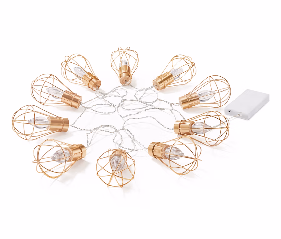Diese Lichterkette setzt bei jeder Weihnachtsdeko leuchtende Akzente – sie kommt mit ihrem coolen Look, aber auch ohne festliche Anlässe aus. Sie besteht aus zehn LEDs, die in Glühbirnenformen aus goldfarbenem Metalldraht fest installiert sind. Die Kette ist als Dekoration für den Innenbereich gedacht und kann aufgehängt oder als gelegtes Leuchtbündel verwendet werden.
