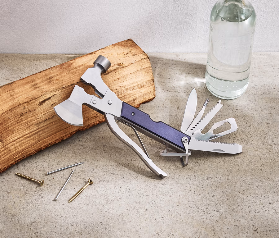 • 11 Funktionen: Axt, Hammer, Glattschliffmesser, Zange, Feile, Holzsäge, Säge, Kreuzschlitz-Schraubendreher, Schlitz-Schraubendreher, Schraubenschlüssel (6, 7, 8, 10 mm) und Flaschenöffner