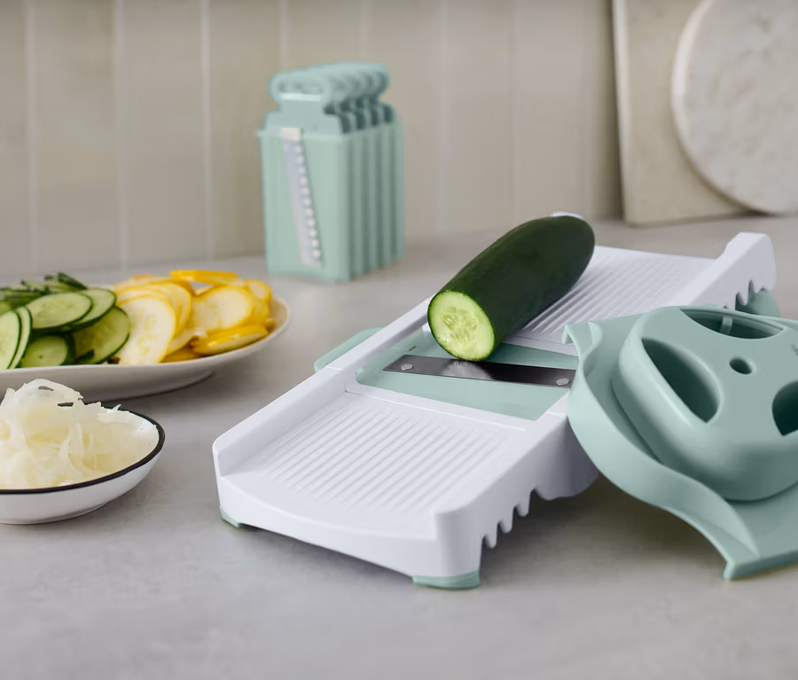 • Grob- und Fein-Raspel, Reibe, Hobel, Julienne- und Rillenschneide-Einsatz mit Aufbewahrungsbox